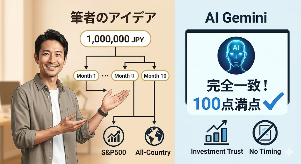 Gemini(AI)の評価: 筆者の分割投資案を「初心者のメンタルを守る完璧な最適解」と絶賛。さらに、ETFよりも金額指定・自動再投資ができる「投資信託」を推奨。