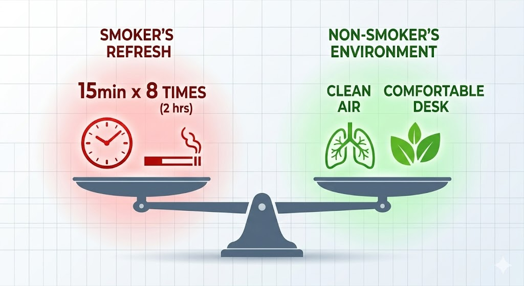 綺麗な空気の快適なデスク環境で仕事ができるなら、タバコ休憩の1時間や2時間、寛容な気持ちで許してあげてもいいのではないか。