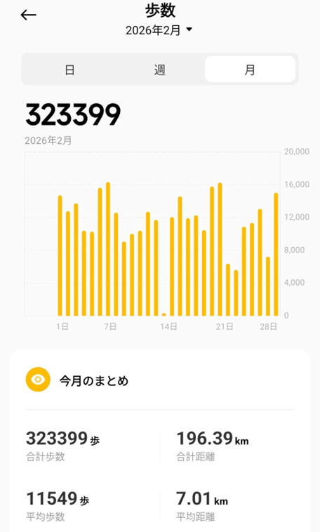 2026年2月は、28日間という短期間ながらジム通い27回、平均1万歩超えという驚異的なバイタリティを発揮。