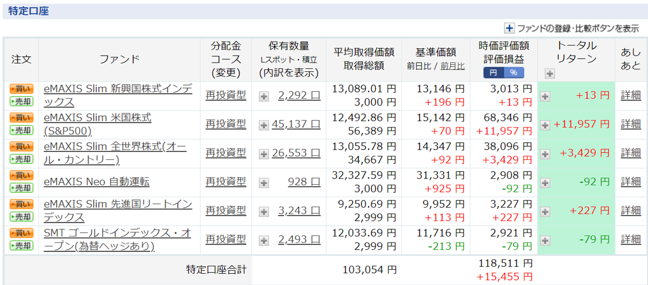 メインは積み立てNISAでしたが、楽天証券の投資信託のクレカ決済1%ポイント還元の上限の5万円/月と、SBI証券でも3万円/月(こちらは毎日積み立て)の合計約8万円/月を基本の追加運用資金としてコツコツ続けています。