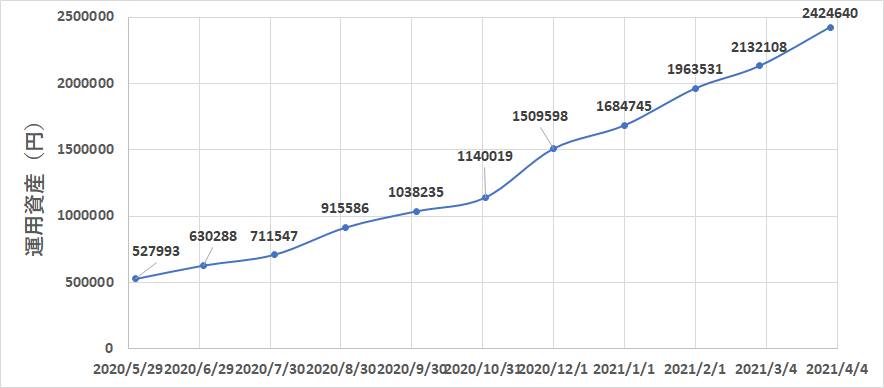 先月1日から、大幅に上昇して+30万ほどになりました。運用額240万円突入です!