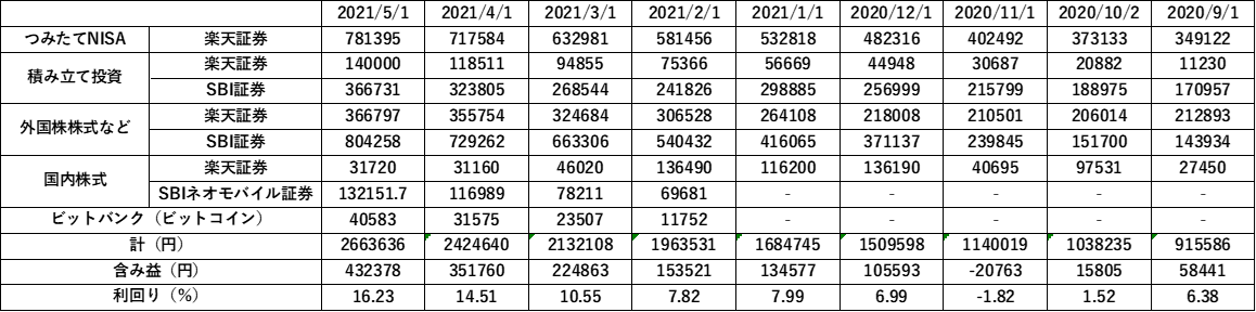 データを残している2020年3月からの状況をまとめてみました。(表、グラフは適宜抜粋)先月1日から、大幅に上昇して+20万ほどになりました。運用額260万円突入です!