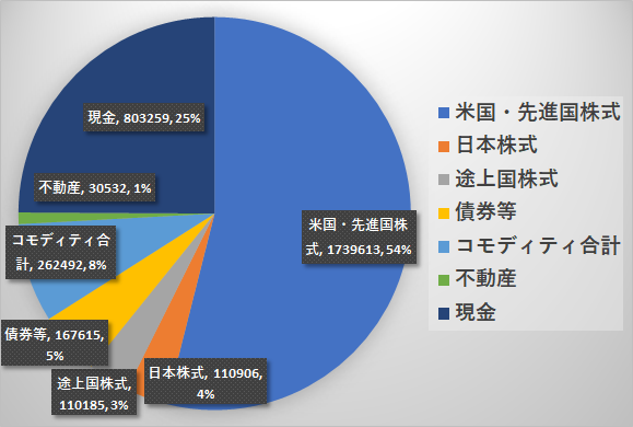現金は現状維持で、その他すべてのリスク資産は順調に増えているのが見えます。途上国株式や債券、コモディティの購入を進めたことで、理想のポートフォリオとほとんど同じ形になっています。