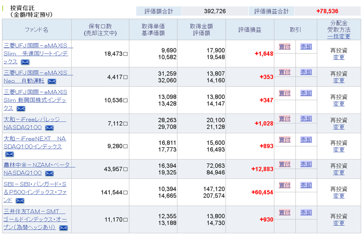 楽天証券と同様でS&P500は横ばいでしたが、含み益がやや増えました。ただ、ナスダックは若干回復が遅く、先月よりもマイナスでした。ゴールドは延びてきました。全体としては若干の上昇ですね。含み益も+75,000円→+78,000円まで上昇しています。 毎日積み立て額をiFreeレバ200円、先進国REIT200円、自動運転150円、新興国株150円、iFreeNEXT150円、農林中金150円、ゴールド150円、SBIバンガード150円に変更しています。手数料なども考慮しながら、分散を利かせた積み立て設定にしています。