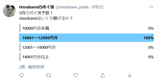 ひとまず毎月恒例ですが、コツコツ積み上げたポイントが1ヶ月でどの程度になったのか、想像しながら結果を見ていただければと思います。また、Twitterの投票機能に参加していただきありがとうございました。この場で改めてお礼申し上げます。今回も、5月分での合計金額予想の投票にしてみました。