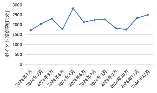 過去1年(2024年1月~12月)の各月ポイント獲得額は以下の通りです。