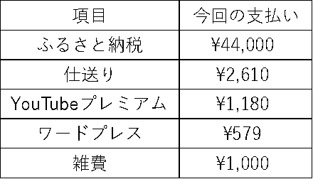 その他は、ここまでに書かなかったものほとんどすべてが当てはまります。 今回は、50,000円近くとかなり金額が多くなっていますが、大部分はふるさと納税です。計算したところ、今年の枠が44,000円+αだったので、しっかり44,000円分を楽天市場で購入しました。 あと固定でかかるのは、YouTubeプレミアム(1,180円)とワードプレスの分(579円、3年分前払いで月換算)くらいですね。広告なしを経験してしまうと無料版には戻れなくなりました(笑)