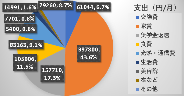 それでは、同様に支出を計算してみました。いつもよりは、おおざっぱな分け方をしています。細々とした支出はその他へ。