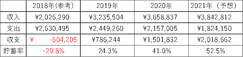 過去4年間(2018年は参考データ、2021年は上半期×2と予想値)について、同様に計算してみました。収入と支出から収支、収入と支出から貯蓄率が計算できます。