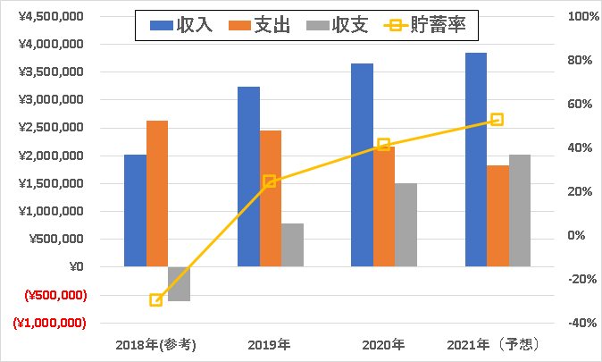 2018年は、学生の期間も含むので参考になってしまいますが収支はマイナスで、2019年以降は収支がプラスになり、年々その収支は増えていて、2021年では9月賞与と12月賞与次第ですが、2,000,000円を超えてくるのではないかと予想しています。貯蓄率も50%を超えてきそうな勢いです。貯蓄5割超えれば家計は十分安定すると思います。最低でも3割くらいあるといいですよね。