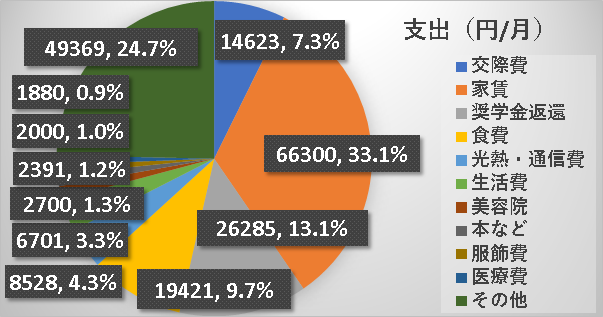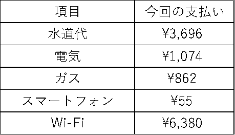 まずは固定費からということで、固定費と設定しているのは、家賃、奨学金、水道光熱通信費です。奨学金も毎月の金額が変わらないので、固定費ということで。 水道光熱通信費に含めているのは、水道代(2か月ごとで今月の支払いはなし)、電気代、ガス代、スマートフォン、Wi-Fi回線利用料の5項目です。