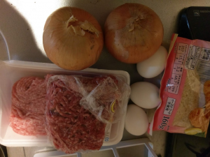 ひき肉600g、玉ねぎ2個、卵3個、パン粉60gくらい。
