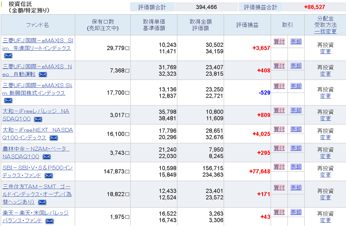 そして、毎日積み立て額をiFreeレバ:300円(400円)、先進国REIT:200円、自動運転:150円、新興国株:150円、iFreeNEXT:200円(300円)、農林中金:200円(300円)、ゴールド:150円、SBIバンガード:150円、USA360:200円(新規追加)に変更しています。(カッコ内は先月までの積み立て額)手数料なども考慮しながら、分散を利かせた積み立て設定にしています。