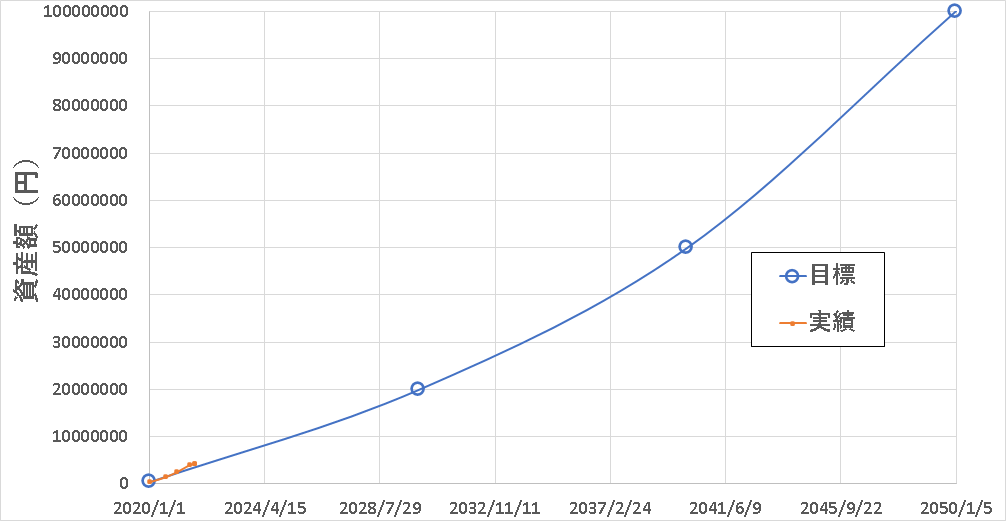 一応、開始日として2020年1月1日(総資産約50万)を設定して、それぞれ10年後、20年後、30年後に資産をどうしていたいかを決めたということです。目標設定に対して、時々、たとえば3か月とか6か月くらいに一度、その時点での実績を確認して、目標に対して今どの辺にいるか、目標より上か下か一目で見えるようにしています。