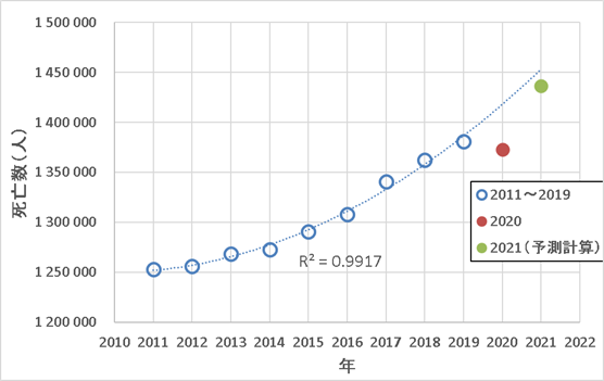 これらのデータをもとに、2011年からの死亡数の推移を示した。点線は、2011年~2019年の死亡数から予測した曲線を2021年まで延長したものです。(近似曲線を2次関数にしました。本当は指数とか一次関数などが望ましいとは思っているのですが、2次関数が良さそうということで)