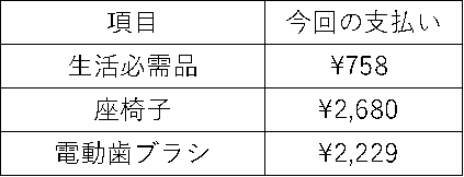 生活費に入れているのは、いわゆる生活必需品や家電、雑貨等ですね。種類が多いので全部ではないですが、洗剤、ティッシュ、歯ブラシ、歯磨き粉、せっけん、シャンプー、などでしょうか。 だいたい20日にウエルシア薬局でまとめ買いをしています。近くにウエルシアがあって本当に助かる!ありがとうウエルシア!!! 普段の支出額としては1,000円~2,000円程度ですね。普段よりも支出が多くなったのは、座椅子を購入したことと、電動歯ブラシが動かなくなったので新しく購入したためです。