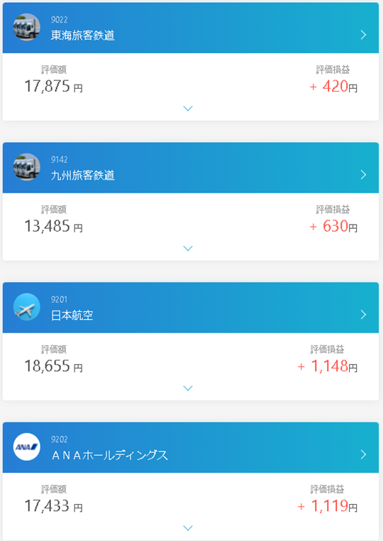 基本的には、各社1万円前後を上限に集中投資しないことにしていますが、下がったところで少し追加したいですね。ちょっと入りをミスってしまいましたが、様子見ですね。航空株もJRもまだまだ回復の余地があるはずなので!単元未満株ということもあって、購入しやすいのは良いですよね。