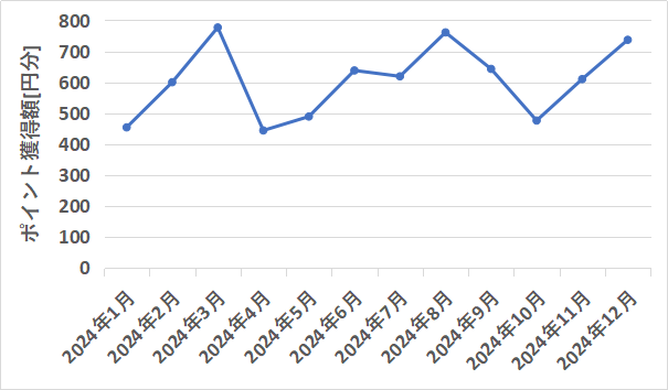 過去1年(2024年1月~12月)の各月ポイント獲得額は以下の通りです。