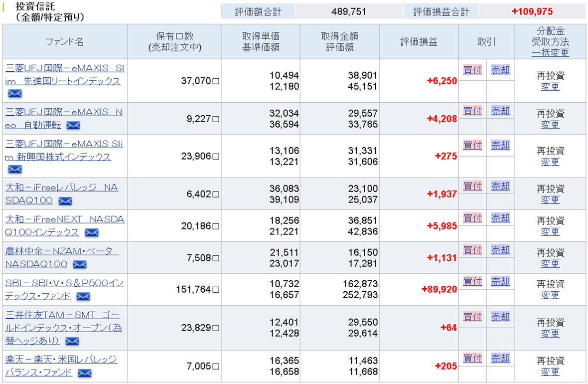 楽天証券口座の投資信託では、毎月積み立て、SBI証券では毎日積み立てにしています。差を見てみたいということ、短期的に下がったところを逃したくないという意味でそのように設定しています。 そして、毎日積み立て額をiFreeレバ:300円(400円)、先進国REIT:200円、自動運転:150円、新興国株:150円、iFreeNEXT:200円(300円)、農林中金:200円(300円)、ゴールド:150円、SBIバンガード:150円、USA360:200円(新規追加)に変更しています。(カッコ内は先月までの積み立て額)手数料なども考慮しながら、分散を利かせた積み立て設定にしています。