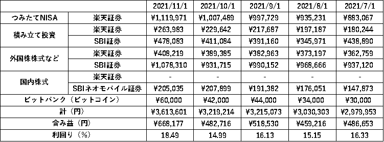 先月1日からの1ヶ月で、含み益が17万円以上も増えました!1ヶ月でこれほど伸びたのは半年ぶりくらい。上昇額は過去一です。運用額も先月から40万円ほど増え、360万を超えてきて400万円が見えてきましたね。もちろん、現金として持っている部分があるので、すぐにでも400万円以上にすることは可能ですが、運用のルールを守りつつ、今年中に400万円に乗せられるといいなあと何となく思っています。