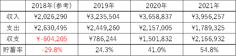 過去4年間(2018年は参考データ)について、同様に計算してみました。収入と支出から収支、収入と支出から貯蓄率が計算できます。