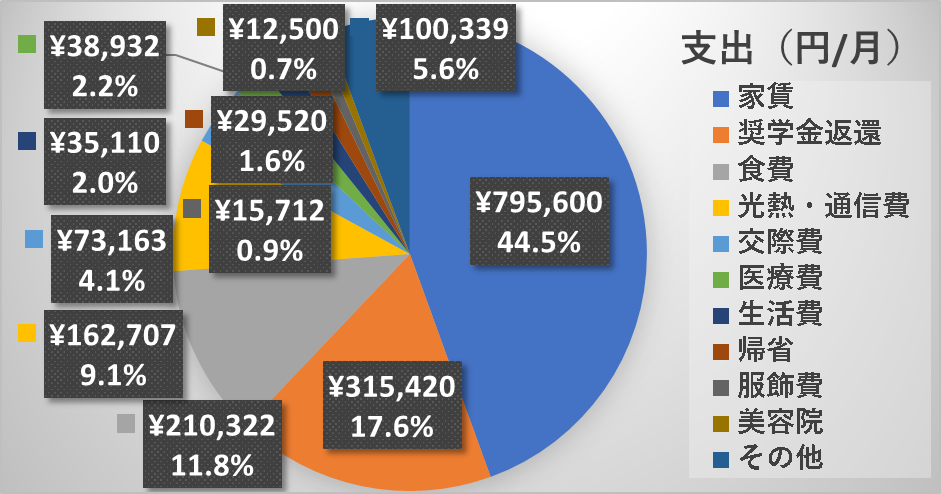 それでは、同様に支出を計算してみました。いつもよりは、おおざっぱな分け方をしています。細々とした支出はその他へ。