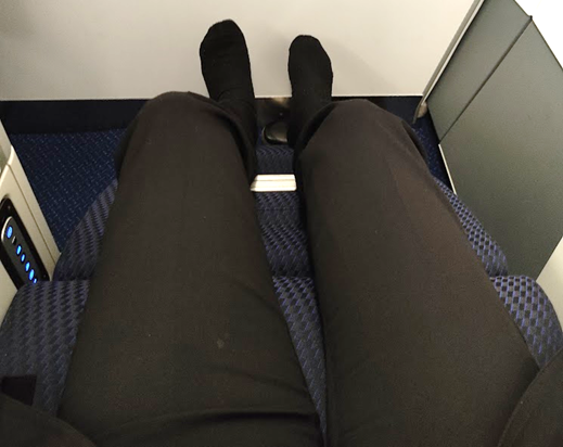 エコノミーしか乗ったことがない私にとって、プレミアムクラスは凄い!の一言でした。優先搭乗・優先降機はもちろんのこと、まず席が全然違いますよね、席が広いし足が伸ばせる!快適ですね。リクライニングが感動モノです。私の足が写ってしまっていますが、それくらいの感動でした。