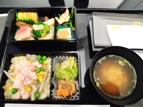そして、プレミアムクラスでは機内食があるということで、安定飛行になってからしばらくして機内食サービスが始まりました。機内食はこんな感じ。さらに、ドリンクサービスもあって、普通に夕食として充実した時間を過ごすことができました。いつもと違う約1時間30分はあっという間に終わってしまいました…。