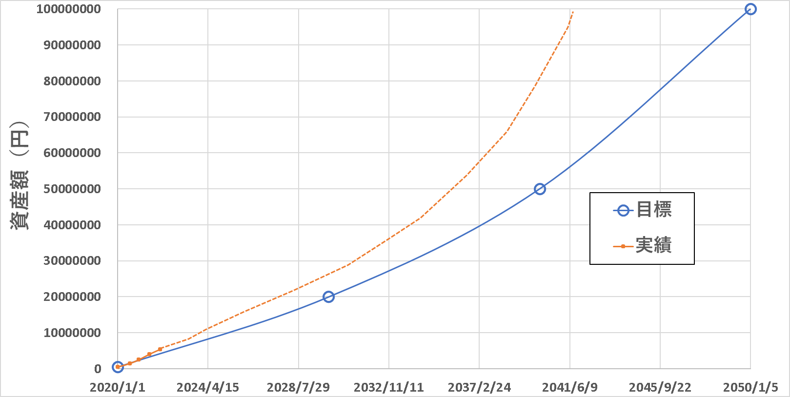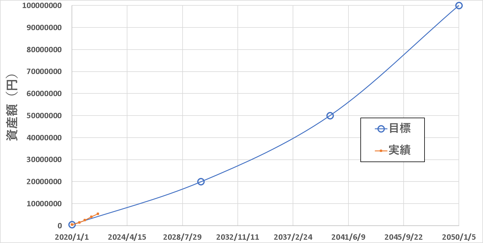一応、開始日として2020年1月1日(総資産約50万)を設定して、それぞれ10年後、20年後、30年後に資産をどうしていたいかを決めたということです。目標設定に対して、時々、たとえば3か月とか6か月くらいに一度、その時点での実績を確認して、目標に対して今どの辺にいるか、目標より上か下か一目で見えるようにしています。