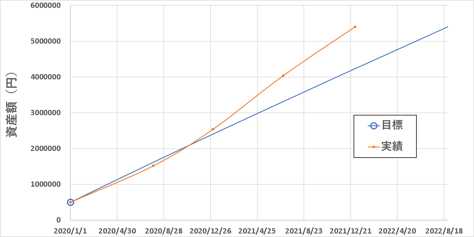 横軸を2年先として、縦軸を600万までにして拡大してみました。こうすると目標と実績の比較がしやすいです。2022年1月時点で、目標が420万~430万くらいにあるのに対して、実績は540万を超えたところです。ということで、目標よりもいい感じで資産が増えてきていることがわかりますね。ペースとしては、7~8か月くらい早く資産が増えてきていることがわかります。