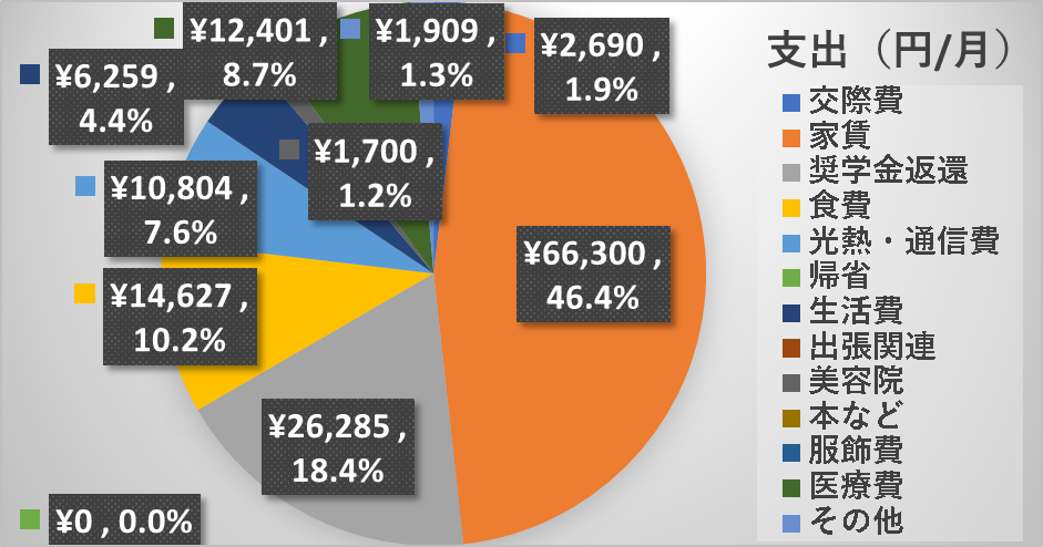 支出の合計は、139,862円でした。1月は12月よりも約3,000円ほど減少しました。平均的な支出額が14万円程度なので、1月も平均的ということになります。13万円前後まで下がると、全然使わなかったなあという感じ。家賃と奨学金で支出全体の7割近いですからね(笑)
