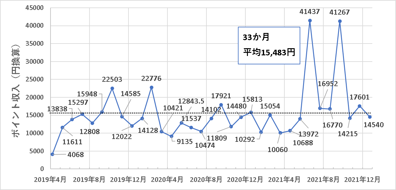 というわけで、2019年5月(月途中から始めたため参考データ)、2020年4月以外の31か月間において、月間10,000円分以上のポイント獲得を達成しています。