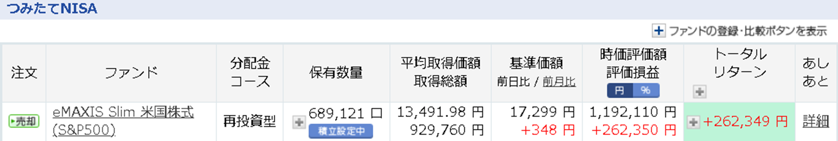 つみたてNISAを始めてから2年半となりました。この3年は相場は非常に良い状況が続いていることもあって、右肩上がりが長期間続いていたことで、今回の一連の下落を受けてもまだ含み益が十分にある状態です。 先月初旬と比較して、トータルリターンがマイナス1万の下落となりました。 (¥272,000→¥262,000)