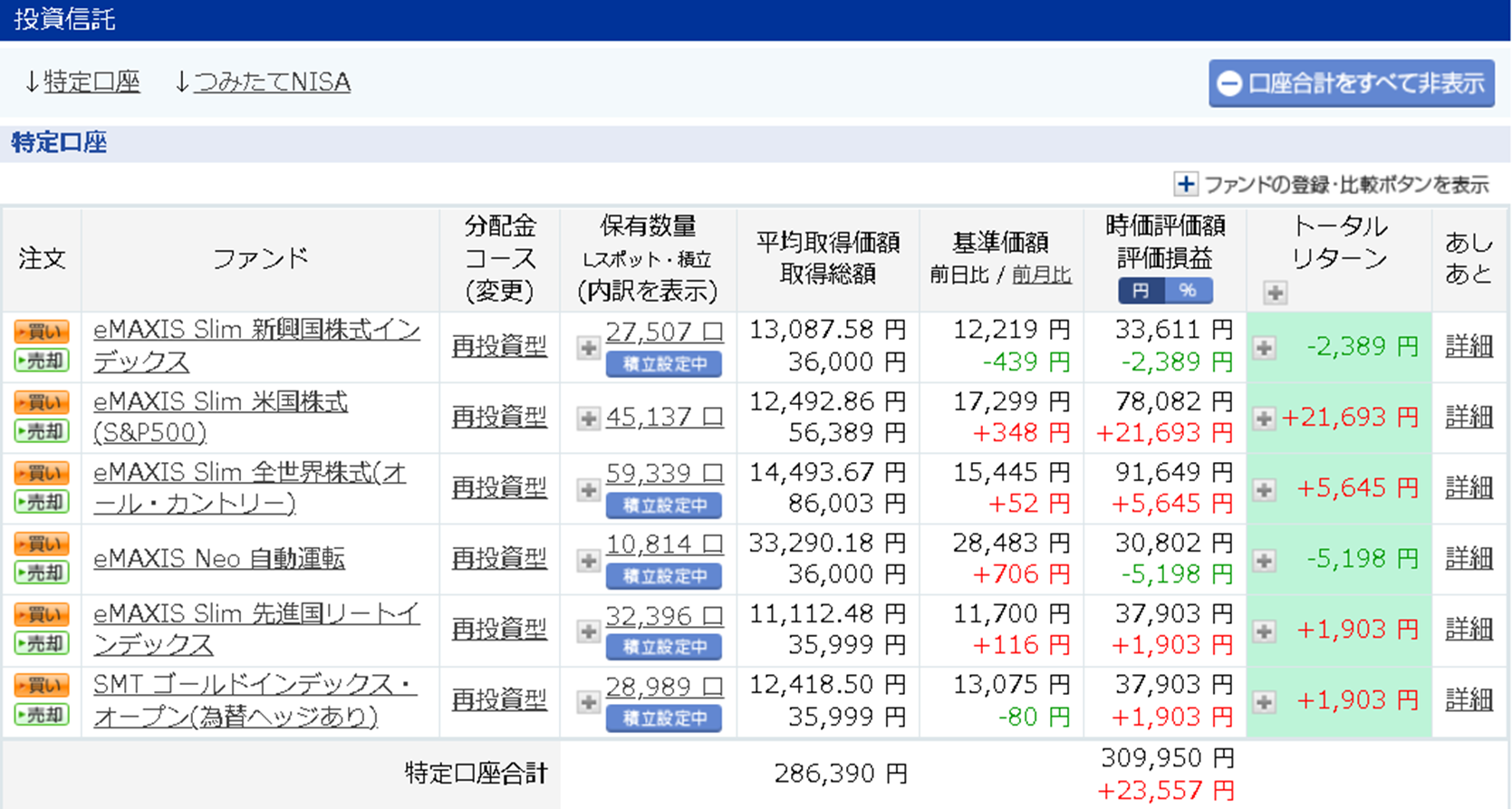 メインは積み立てNISAでしたが、さらに追加で楽天証券の投資信託のクレカ決済1%ポイント還元の上限の5万円/月と、SBI証券でも約4万円/月(こちらは毎日積み立て)の合計約9万円/月を基本の追加運用資金としてコツコツ続けています。
