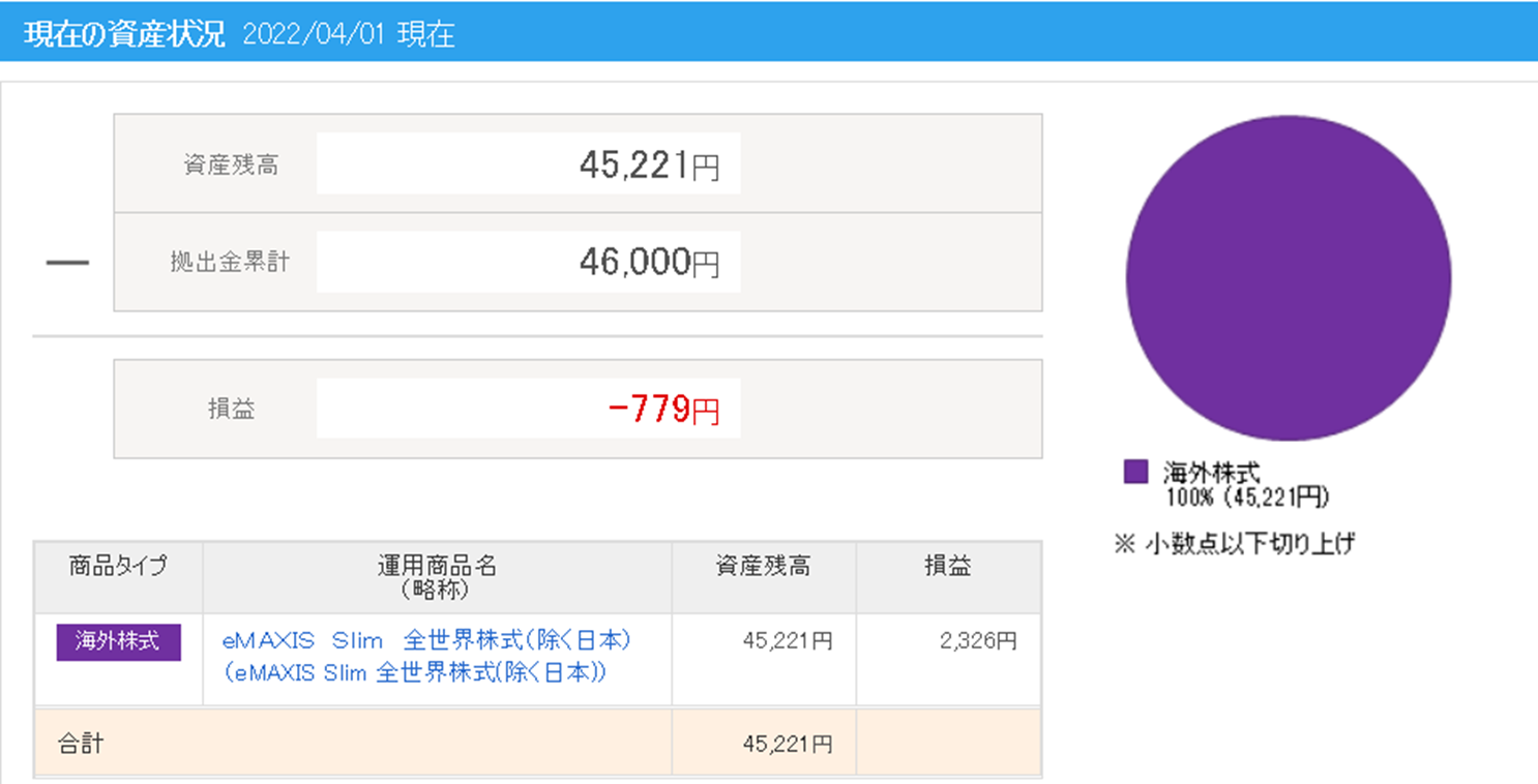 上限の月23,000円の積み立てとなります。今回は、一気に2か月分が引き落としされたので計46,000円というになりますが、次月以降23,000円ずつ積み上げていきます。iDeCoで積み立て投資信託は、「日本を除く全世界株」ということにしました。本当は、自分でポートフォリオを組んでも良かったのですが、運用というより控除のためと割り切って安心して積み上げられる投資信託ということで設定しました。