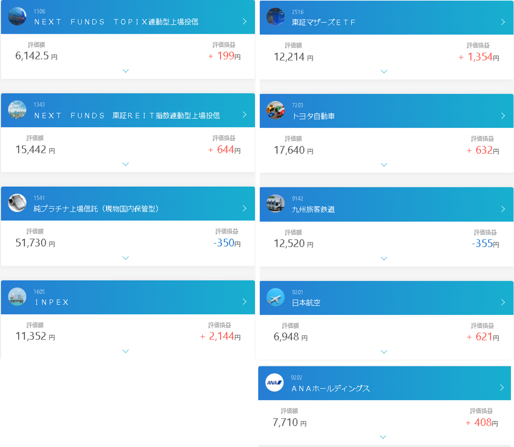 SBIネオモバイル証券では、航空株、JR株などの個別株を中心に、少額運用をしています。現在はリスクが大きいということで、ポジションを小さめにしています。正直、日本に住んで働いている≒日本への投資ということで、日本株にはあまり力を入れるつもりはなくて、余裕資金のさらに余裕資金で運用をしています。応援投資のようなものですね。