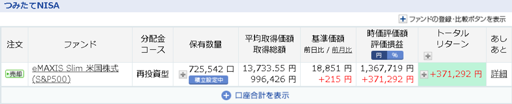 メインは積み立てNISAでしたが、さらに追加で楽天証券の投資信託のクレカ決済1%ポイント還元の上限の5万円/月と、SBI証券でも約4万円/月(こちらは毎日積み立て)の合計約9万円/月を基本の追加運用資金としてコツコツ続けています。