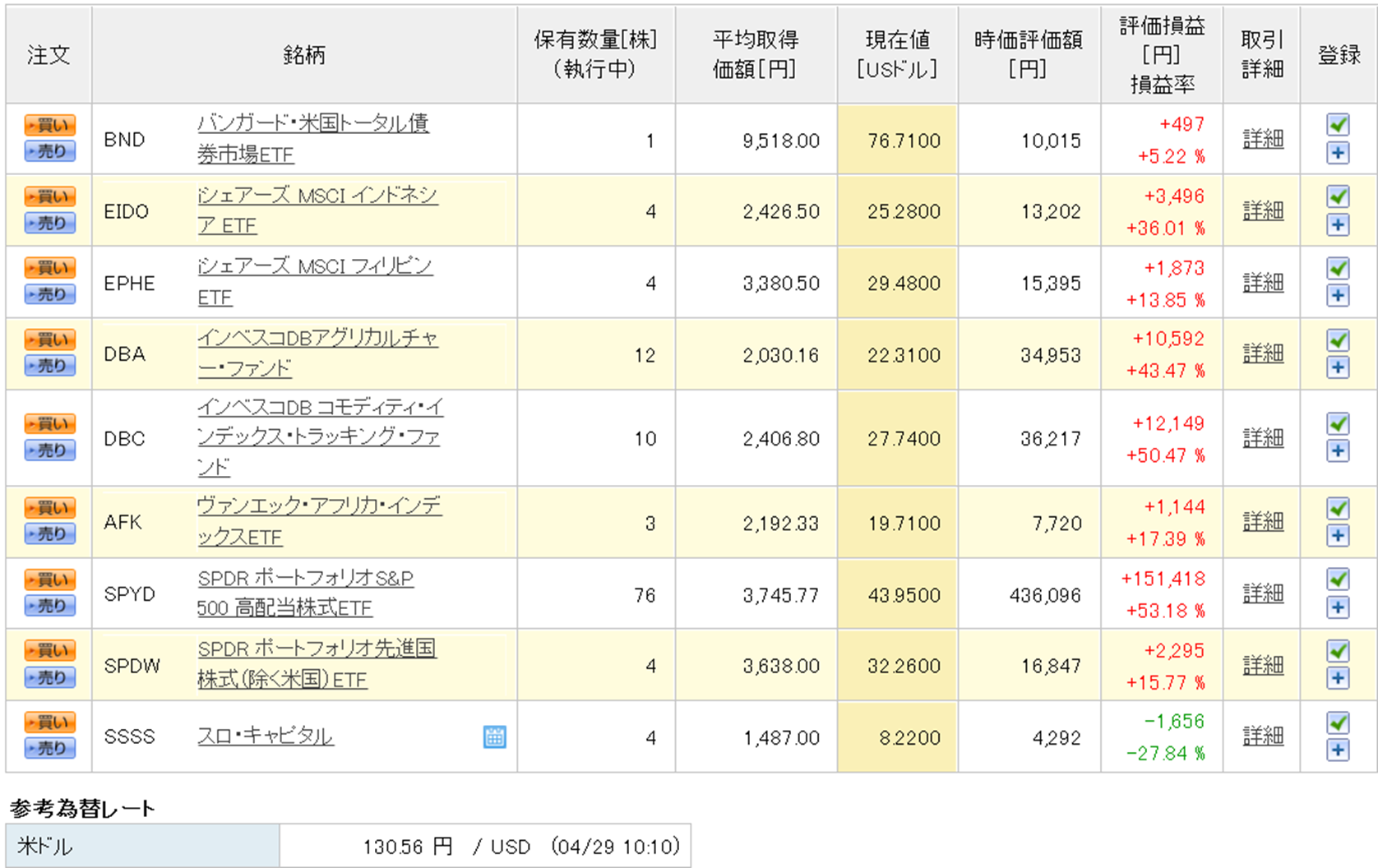 楽天証券の米国株のほとんどはSPYDです。(あくまで配当目当てですが。)含み益も出る上に、さらに配当もあれば気持ち的にはかなり安心です。私が運用している中で一番愛着があり、頑張ってほしいのがSPYDです。ETFの中で一番最初に購入を始めたものでもありますし、今回の下落ではあまり影響を受けていないということもポイントが高いです。