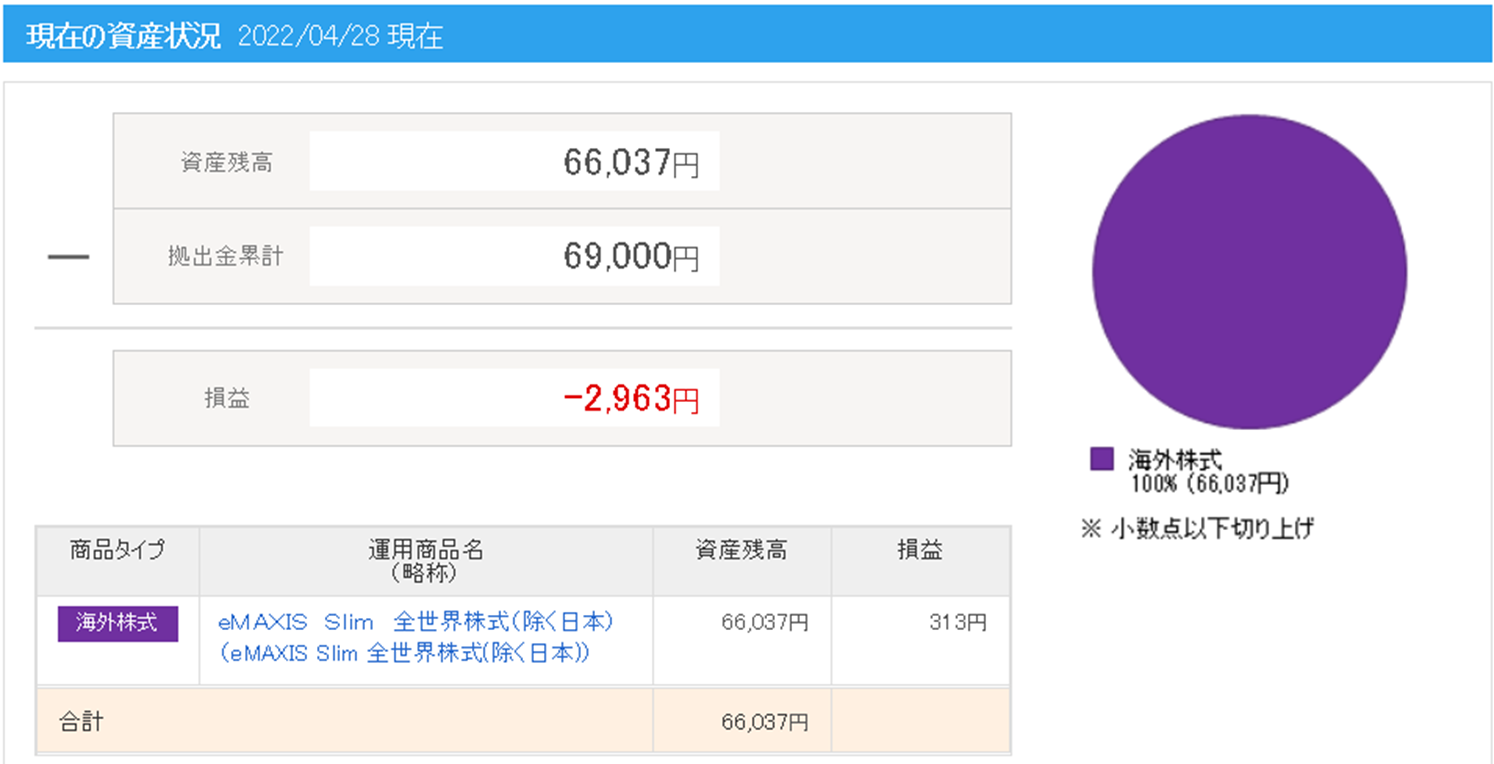 iDeCoについては、上限の月23,000円の積み立てとなります。こちらは、入れたら引き出すこともできないので、この月に1回の振り返り以外でログインすらせずに完全放置の状況です。税控除がメインで、余剰資金の中の余剰資金で行っていることもあり、短期的に多少下がったとしても全く問題ないと思っています。