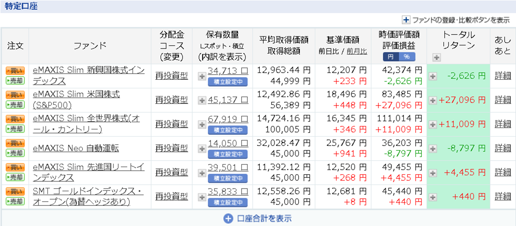 メインは積み立てNISAでしたが、さらに追加で楽天証券の投資信託のクレカ決済1%ポイント還元の上限の5万円/月と、SBI証券でも約4万円/月(こちらは毎日積み立て)の合計約9万円/月を基本の追加運用資金としてコツコツ続けています。