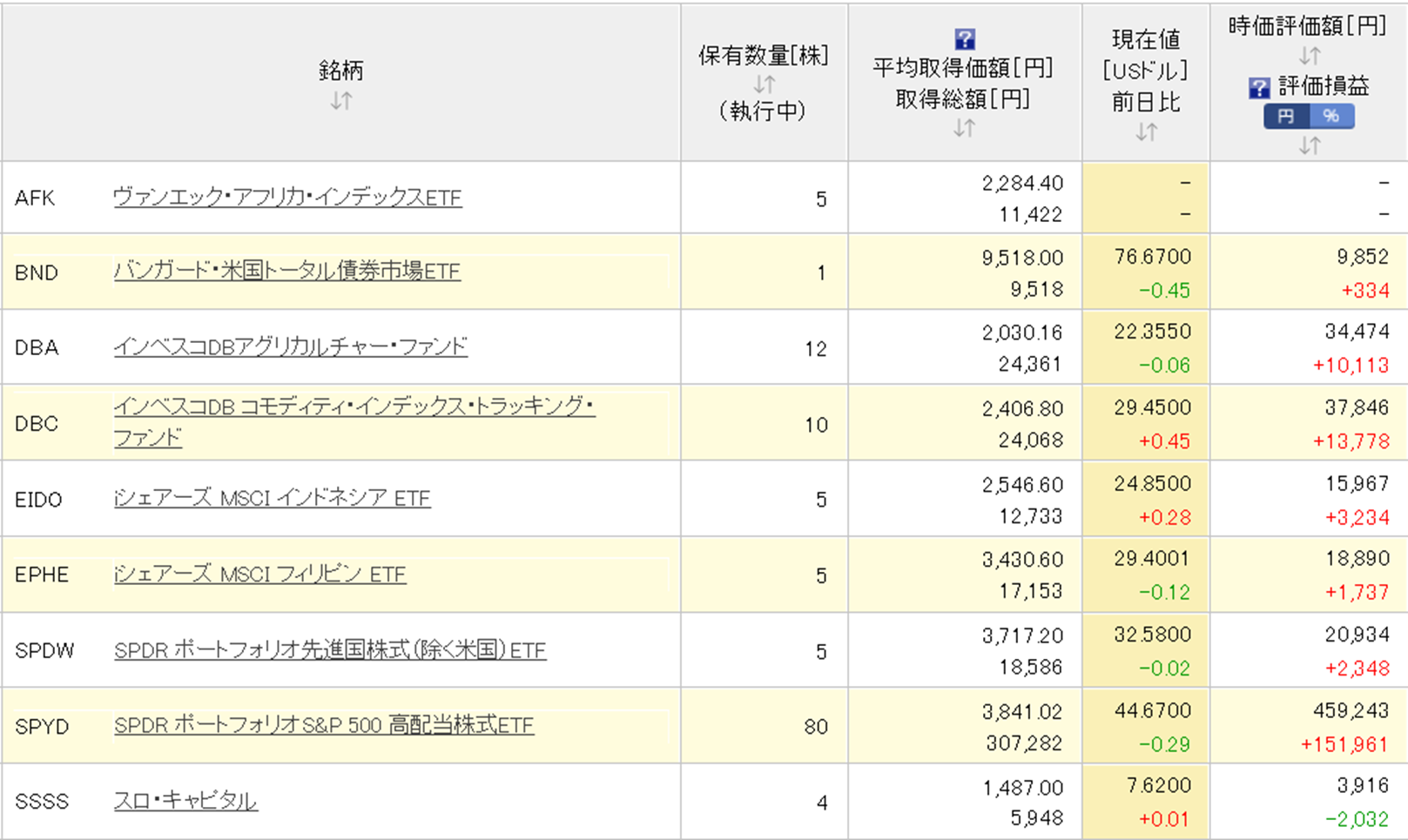 楽天証券の米国株のほとんどはSPYDです。(あくまで配当目当てですが。)含み益も出る上に、さらに配当もあれば気持ち的にはかなり安心です。私が運用している中で一番愛着があり、頑張ってほしいのがSPYDです。ETFの中で一番最初に購入を始めたものでもありますし、今回の下落ではあまり影響を受けていないということもポイントが高いです。