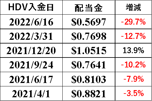 HDVは、2020年の配当は良かった分、2021年はややマイナスといったところでしたが、今回の配当でも3つの高配当ETFの中で唯一のマイナス…。過去6回の配当の内、5回の減配ということで少し心配です。それでも、前々回12月配当では1ドルを超えたので、このまま頑張ってほしいところですね!
