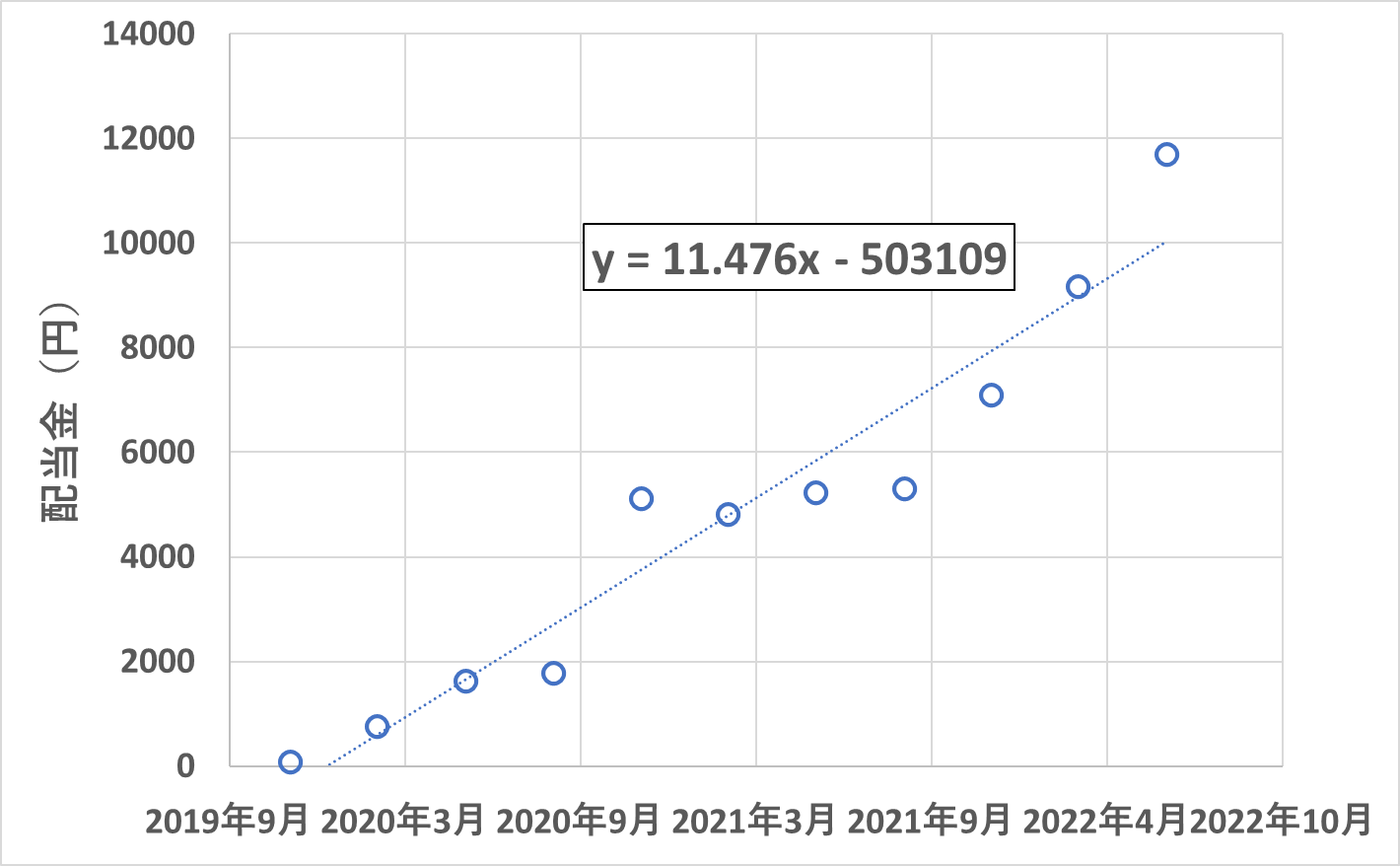 このペースで配当が増えていくと、いつになったら達成できるのか計算してみることにしました。
