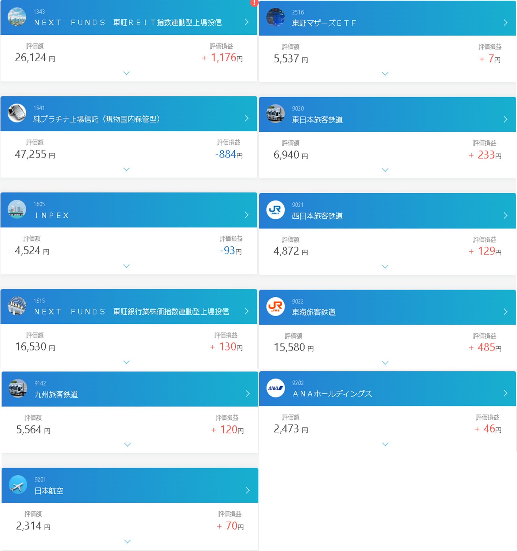 SBIネオモバイル証券では、航空株、JR株などの個別株を中心に、少額運用をしています。現在はリスクが大きいということで、ポジションを小さめにしています。正直、日本に住んで働いている≒日本への投資ということで、日本株にはあまり力を入れるつもりはなくて、余裕資金のさらに余裕資金で運用をしています。応援投資のようなものですね。