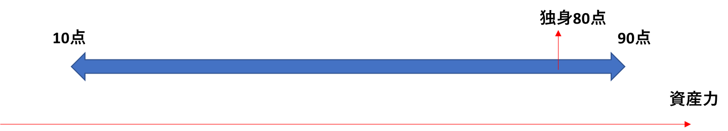 単純に結婚したときの得点がそれぞれ一様になるとすれば、結婚による資産力の期待値は50点です。独身なら80点、結婚すると50点というように下がってしまうことになります。(これもガバガバ計算ですが。)