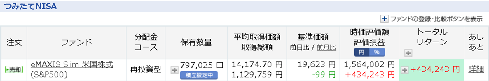 メインは積み立てNISAでしたが、さらに追加で楽天証券の投資信託の(クレカ決済→楽天キャッシュ)1%ポイント還元の上限の5万円/月と、SBI証券でも約5万円/月(こちらは毎日積み立て)の合計約10万円/月を基本の追加運用資金としてコツコツ続けています。