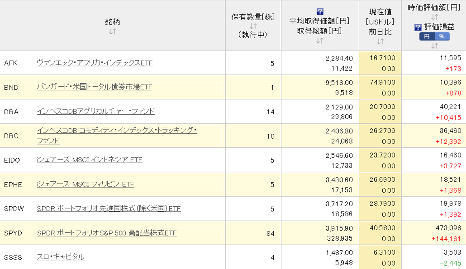 楽天証券の米国株のほとんどはSPYDです。(あくまで配当目当てですが。)含み益も出る上に、さらに配当もあれば気持ち的にはかなり安心です。私が運用している中で一番愛着があり、頑張ってほしいのがSPYDです。ETFの中で一番最初に購入を始めたものでもあります。