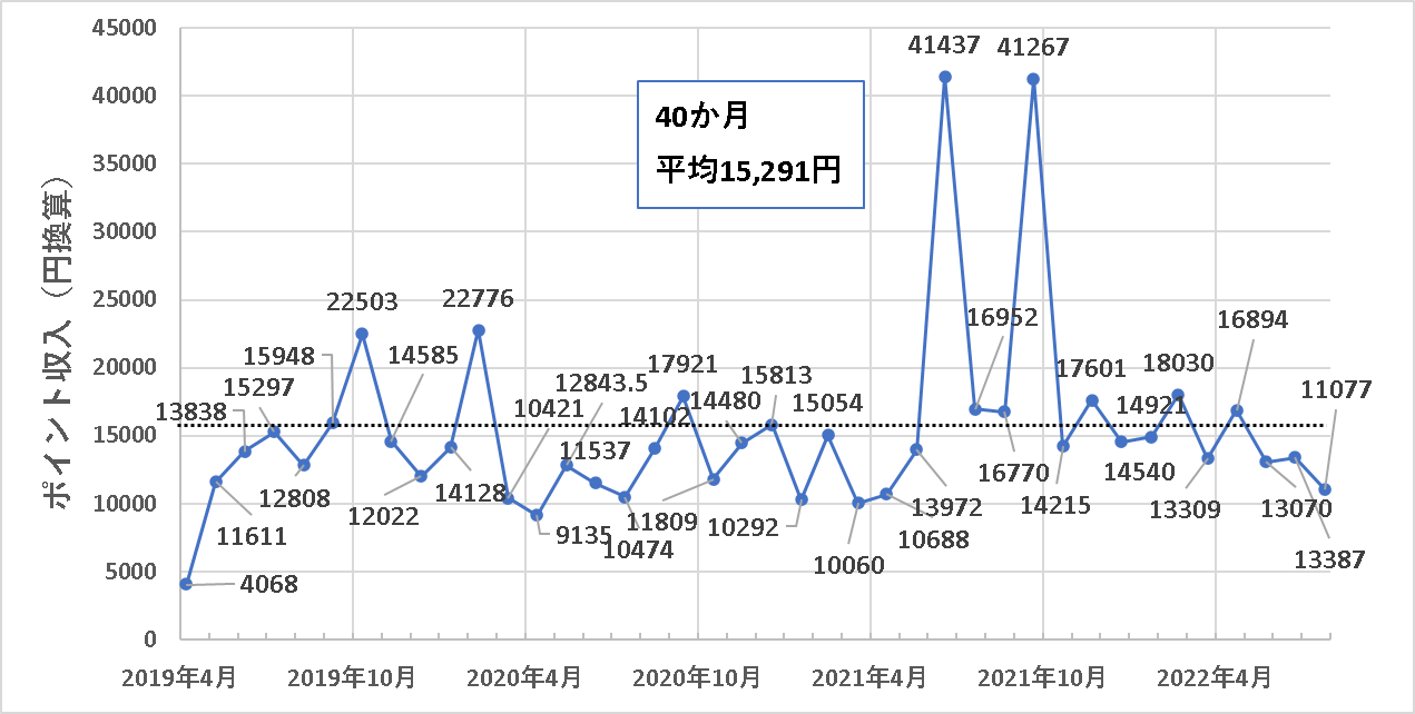 というわけで、2019年5月(月途中から始めたため参考データ)、2020年4月以外の35か月間において、月間10,000円分以上のポイント獲得を達成しています。