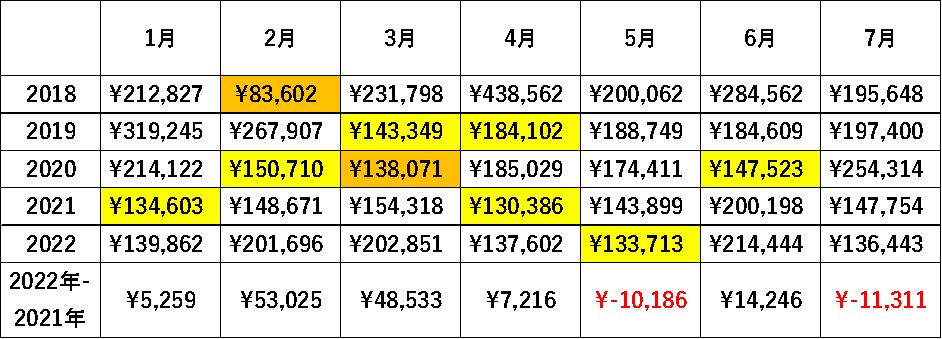 そして、注目なのは15万円以下の月数です。2018年~2020年については、1ヶ月か2か月となっていましたが、2021年&2022年については1年の半分以上となっています。