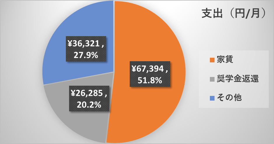 私の家計簿では、家賃と奨学金返還分で1ヶ月の支出の60~70%程度で推移しています。支出を13万円以下と設定した時に、残りで費やせるのが以下の通り、36,321円となるのです。